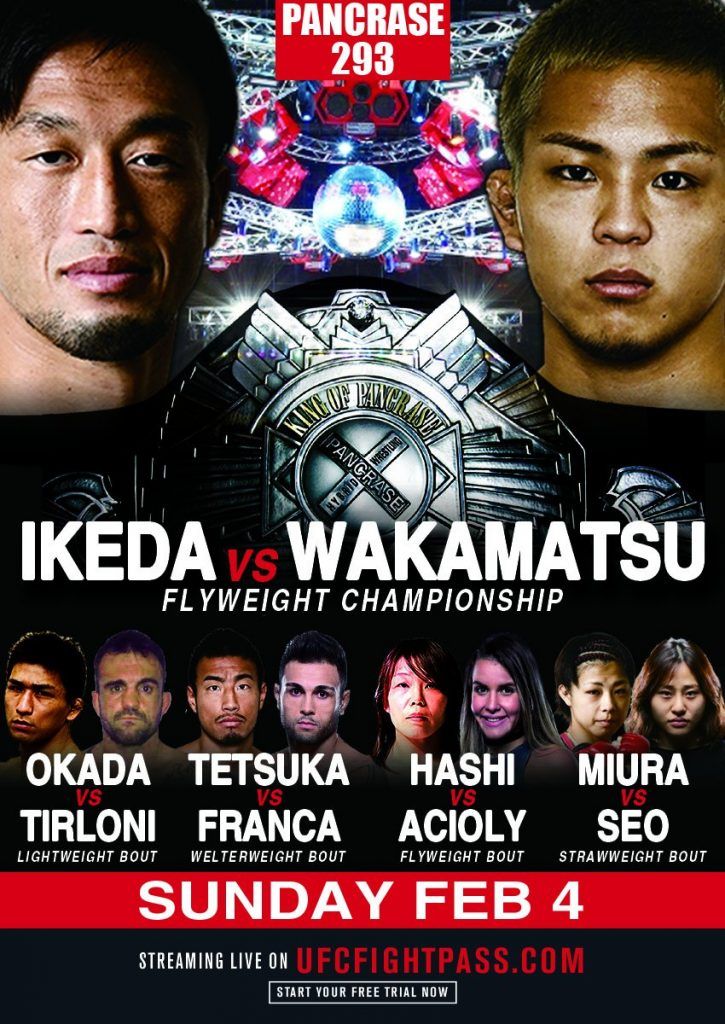 Op zondag 4 februari reisde Pancrase af voor Pancrase 293 naar de Shinkiba Studio Coast in Tokio, Japan. In het hoofdevenement verdedigde de vlieggewichtskoning van Pancrase-kampioen Senzo Ikeda zijn titel voor de eerste keer tegen het 22-jarige Japanse talent Yuya Wakamatsu, die negen opeenvolgende keren achtereen had gewonnen, waaronder acht door knock-out.